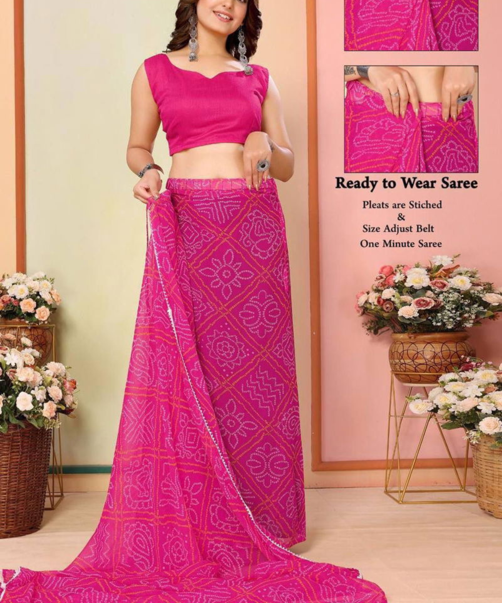 Step into effortless elegance with our Pink Bandhani Ready-to-Wear Georgette Saree, crafted for the woman who loves grace without the hassle. Designed in soft, flowy georgette, this saree comes with pre-stitched draping, making it super easy to wear – just tuck, tie, and shine ✨. The vibrant pink bandhani print brings a fresh, festive charm, while the lightweight fabric ensures comfort all day long. Paired with an 80 cm blouse piece, it’s a perfect blend of tradition and modern convenience. Style it with minimal jewelry or festive accessories – either way, you’re bound to turn heads. Care for it gently with a hand wash or dry clean to keep its charm alive.