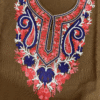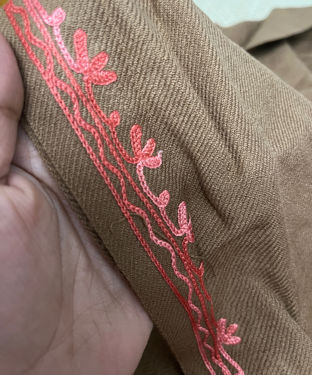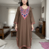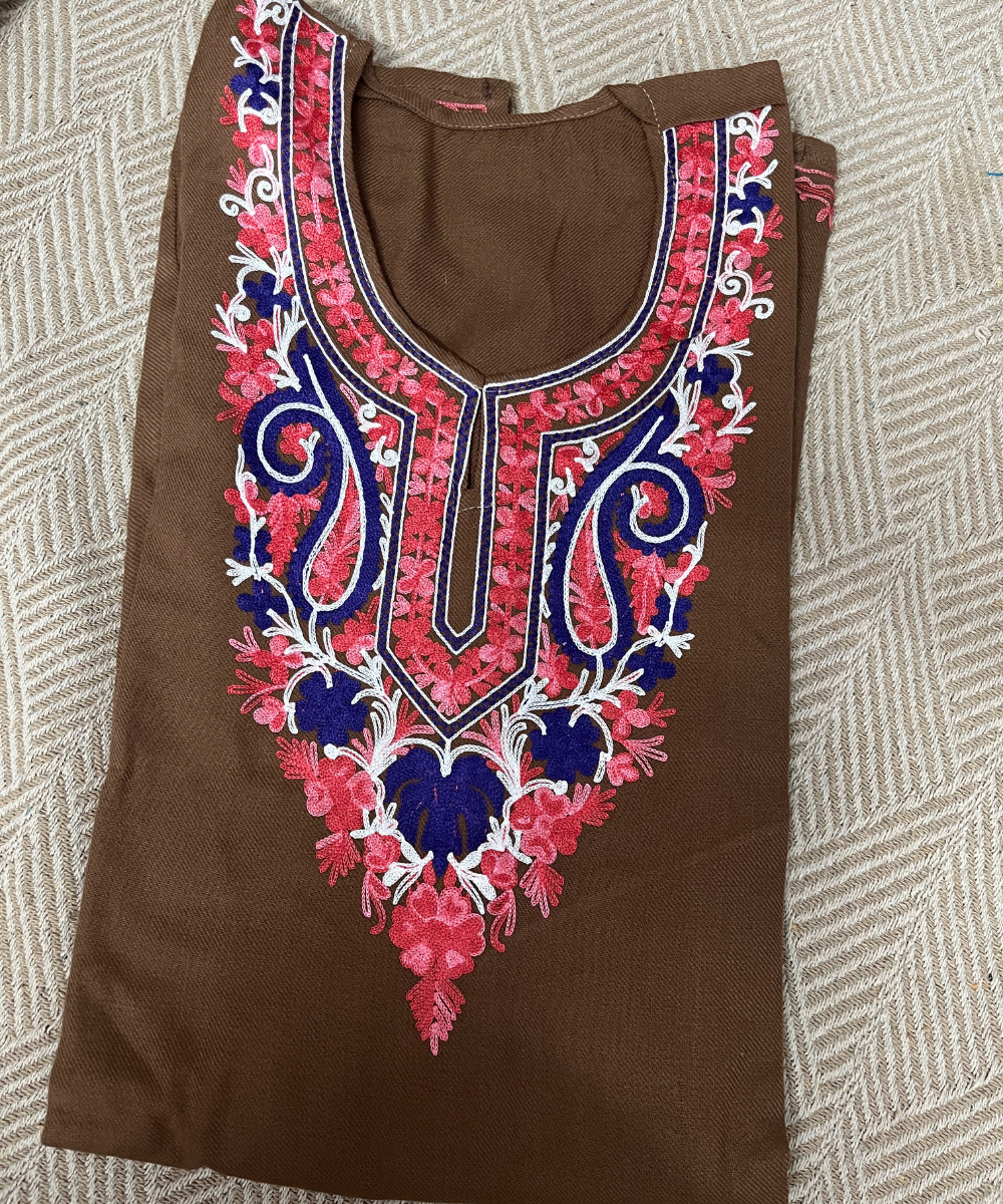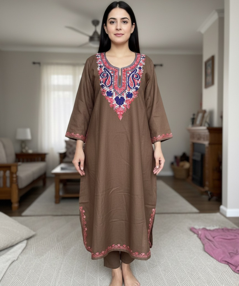 This coffee-brown pheran features rich red, blue, and white Kashmiri embroidered motifs. The bold contrast makes it a standout winter piece for anyone who loves earthy colours with bright detailing. Warm, soft, and perfect for winter layering.