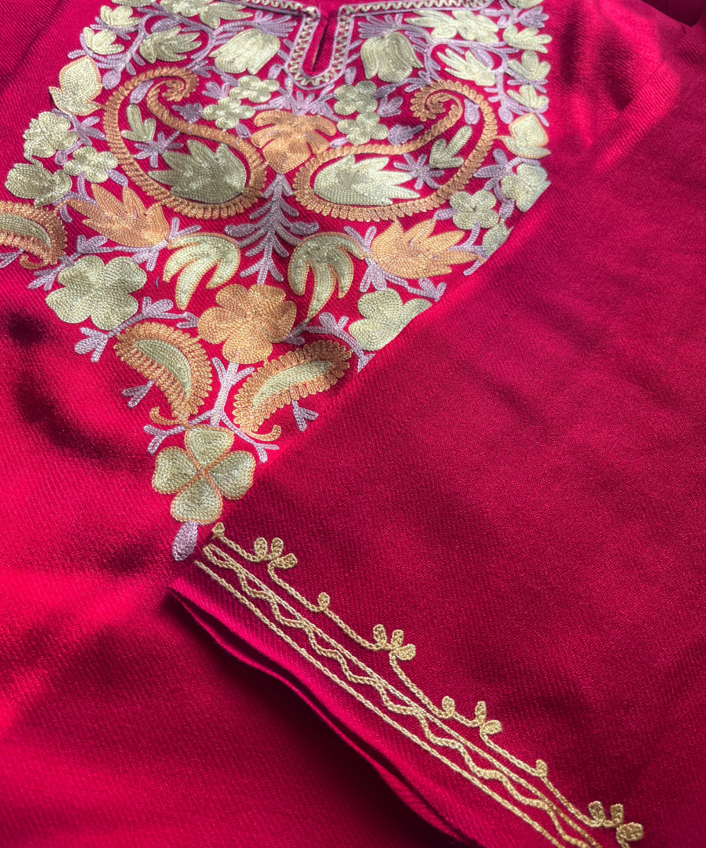 A classy maroon pheran featuring unique Red and Yellow Kashmiri motif embroidery. Trendy yet traditional, this pheran is perfect for women who love modern contrast colours blended with Kashmiri craftsmanship.