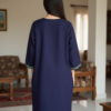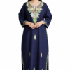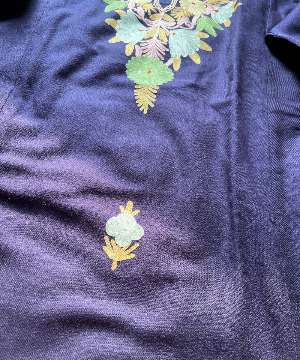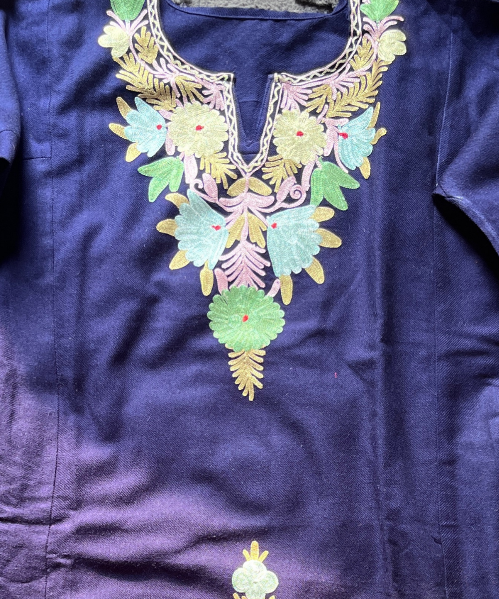 This navy blue pheran boasts luxurious green and yellow Kashmiri threadwork, creating a rich contrast winter look. Perfect for festive wear, college wear, office wear, and everyday winter comfort.