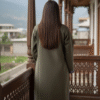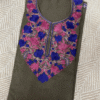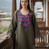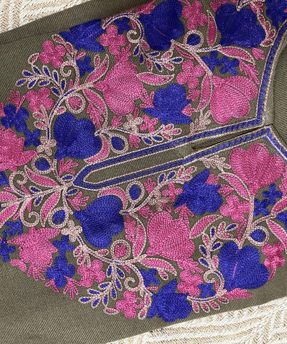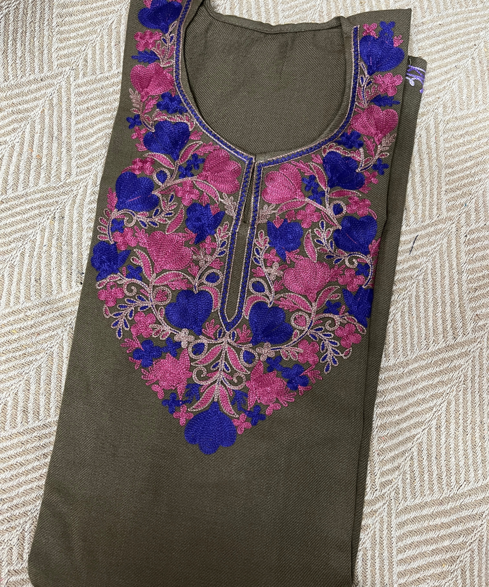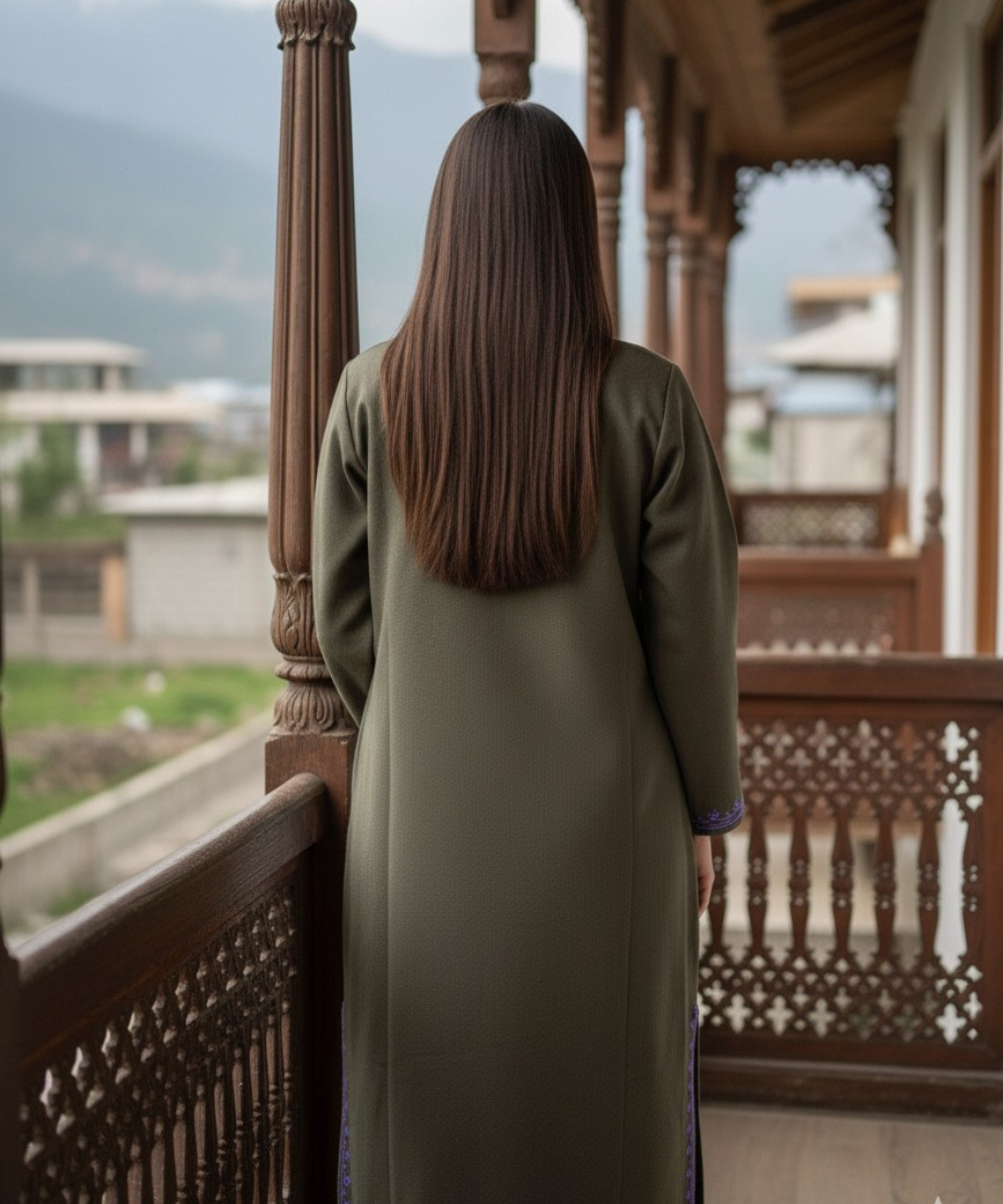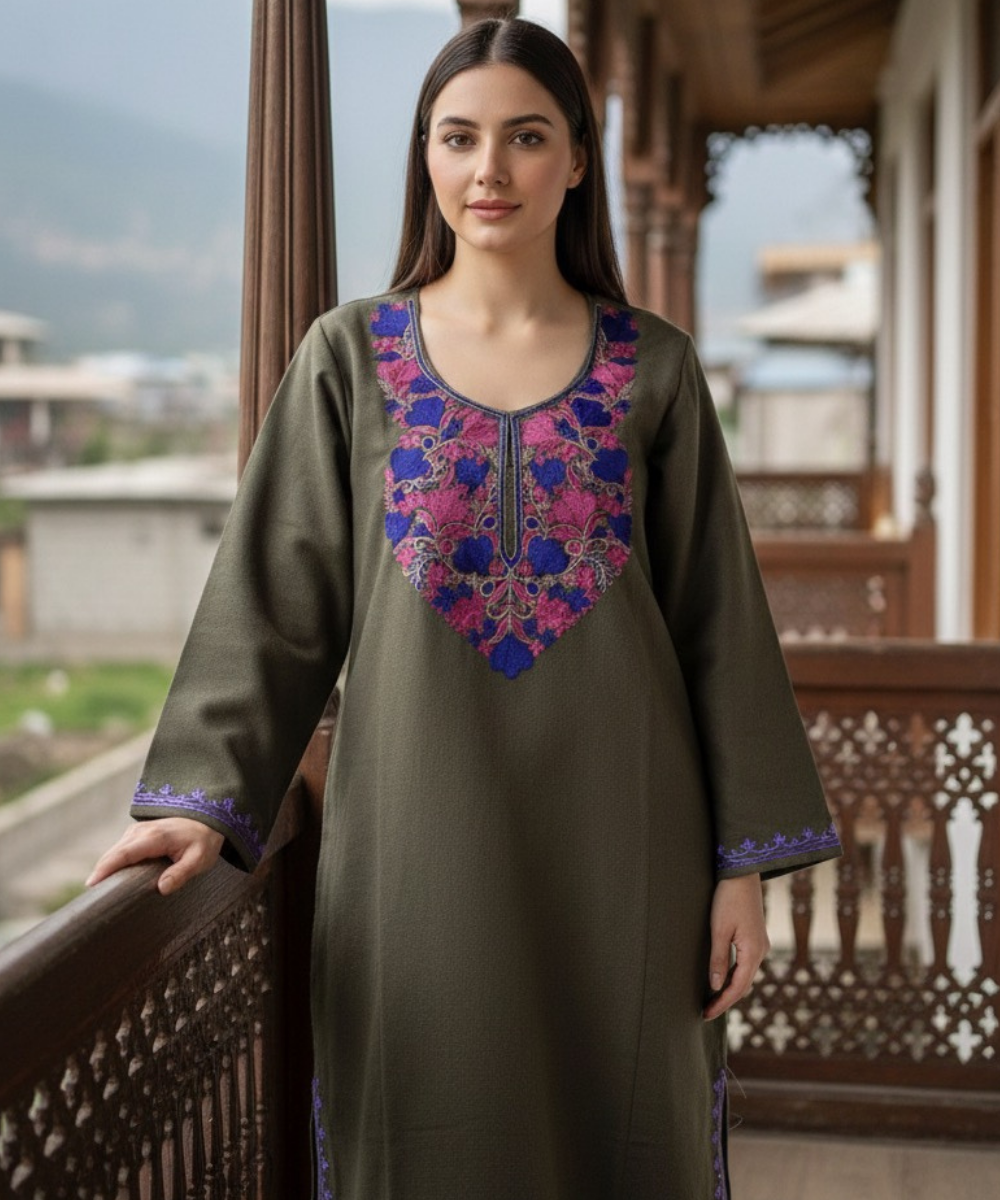 A cosy olive-green pheran decorated with vibrant blue and pink Kashmiri embroidery. The detailed neckline instantly elevates the look, while the soft winter fabric ensures all-day warmth. Ideal for daily winter wear or casual outings.