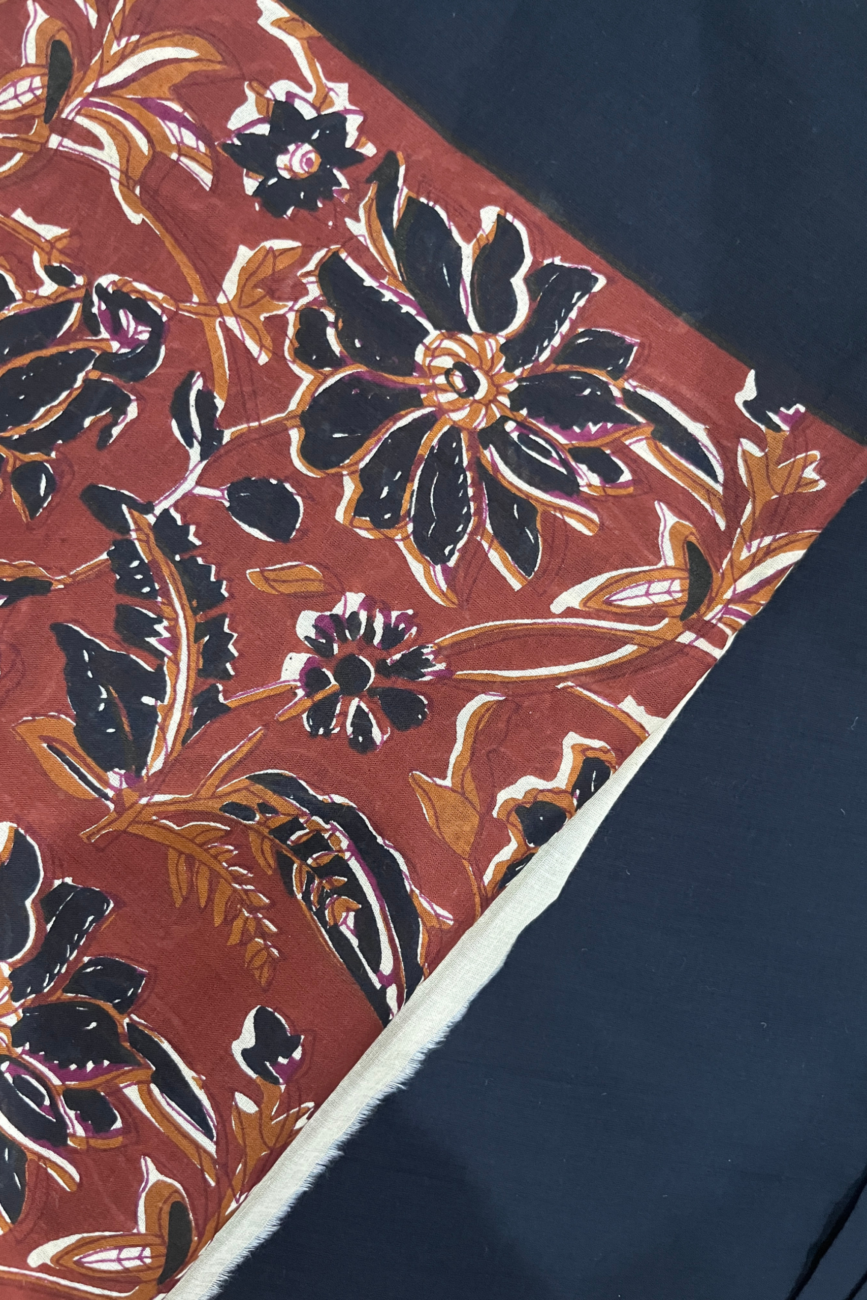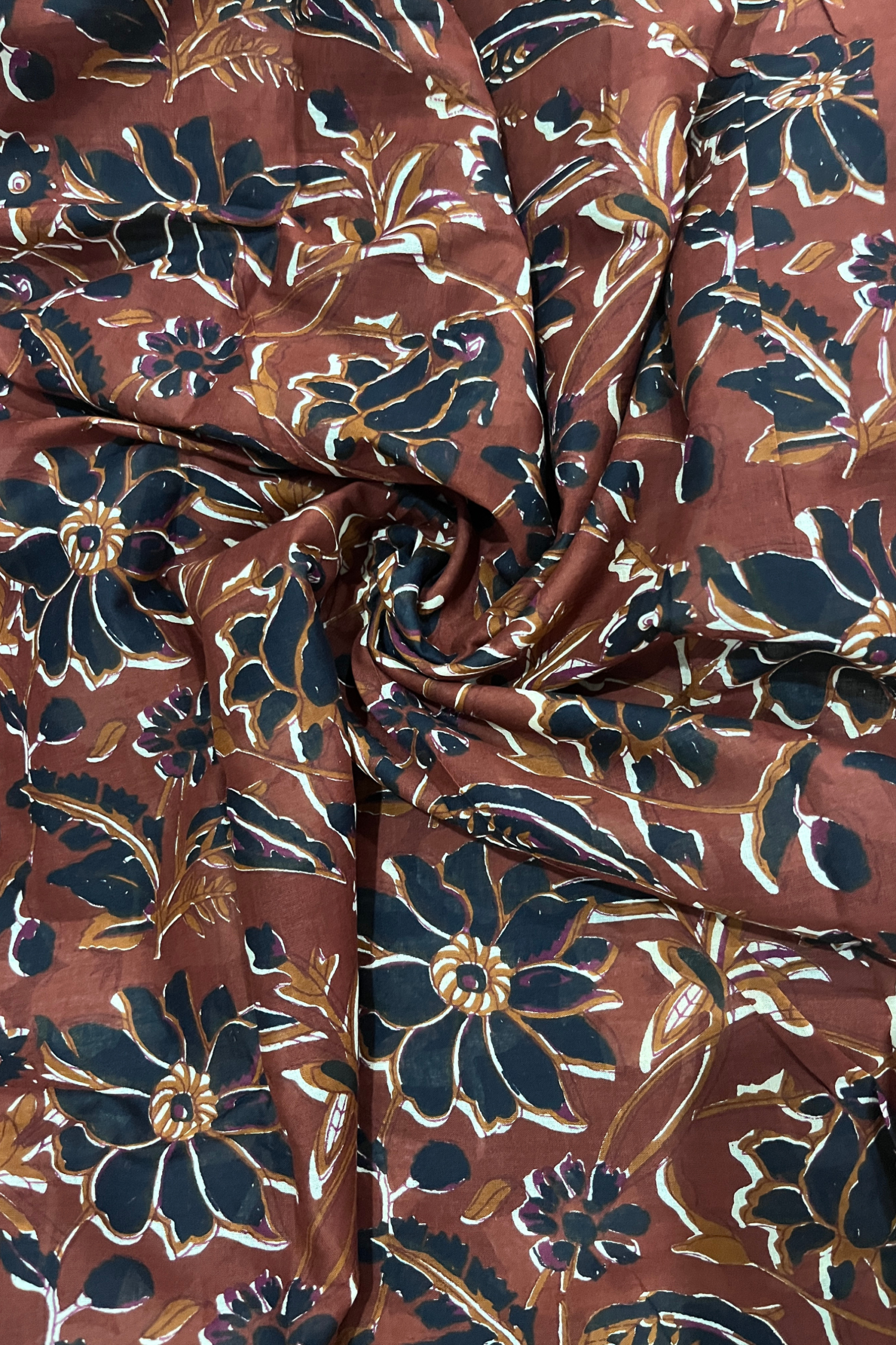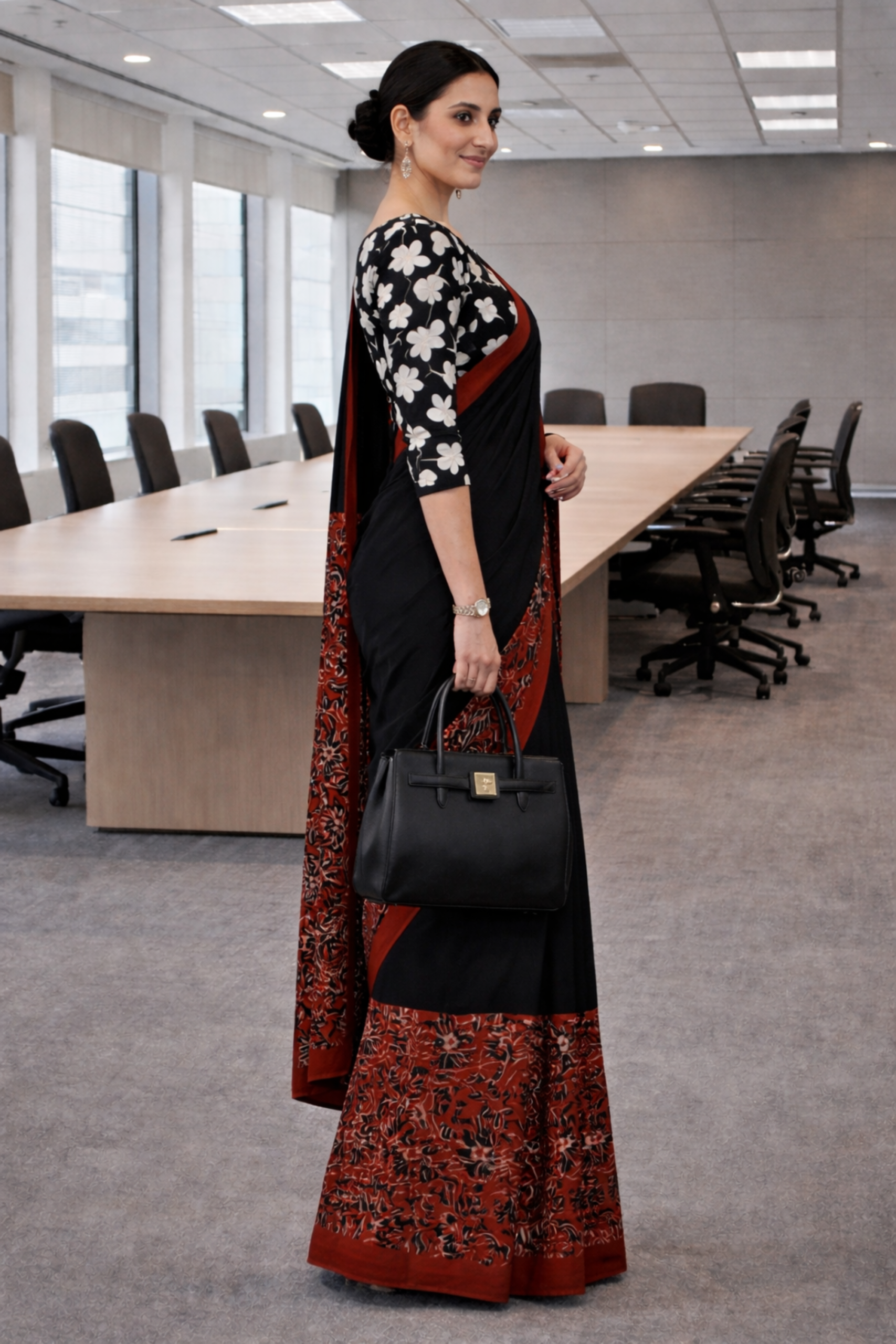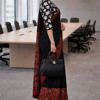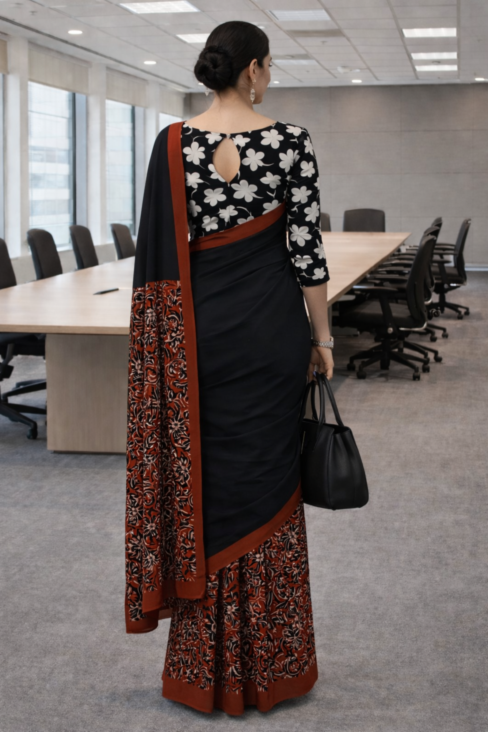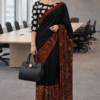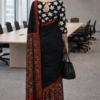 Make a powerful style statement with this elegant black cotton saree, featuring a beautifully detailed rust floral pallu and matching border. The contrast of dark base with warm tones adds depth and sophistication, making it perfect for office wear and formal gatherings.