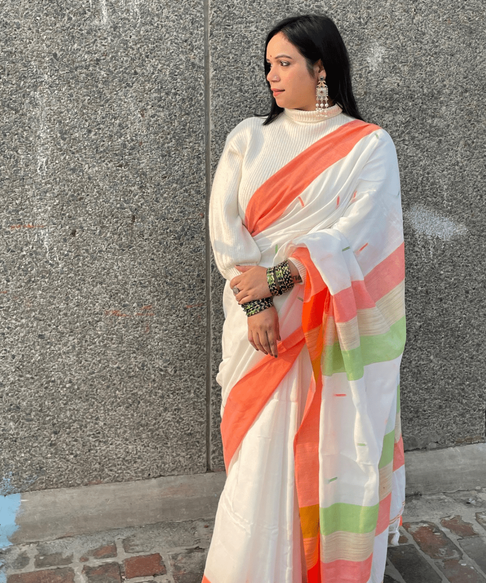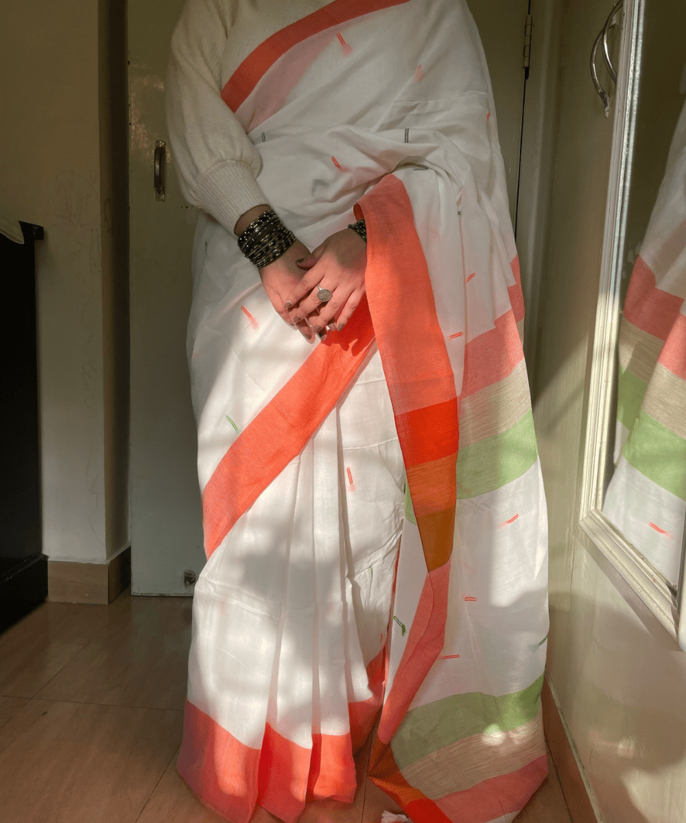 Elevate your wardrobe with this stunning tricolor cotton saree. Crafted with care, it boasts a harmonious blend of white, orange, and green, embodying a patriotic spirit. The lightweight fabric ensures comfort, making it ideal for day-long events or special celebrations. The saree is adorned with subtle embroidered details that enhance its aesthetic appeal. Pair it with a simple blouse and minimal accessories for a timeless and elegant look.