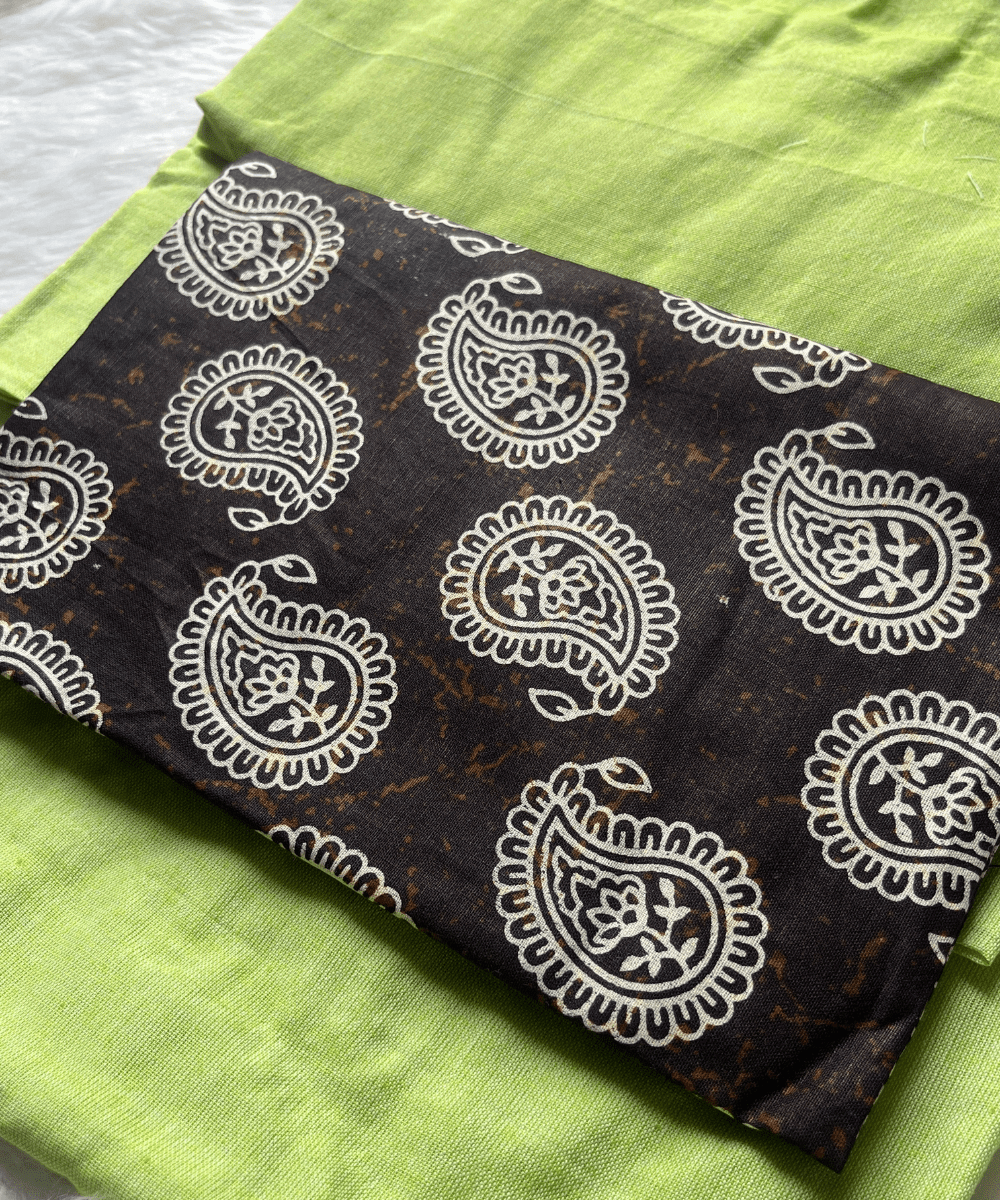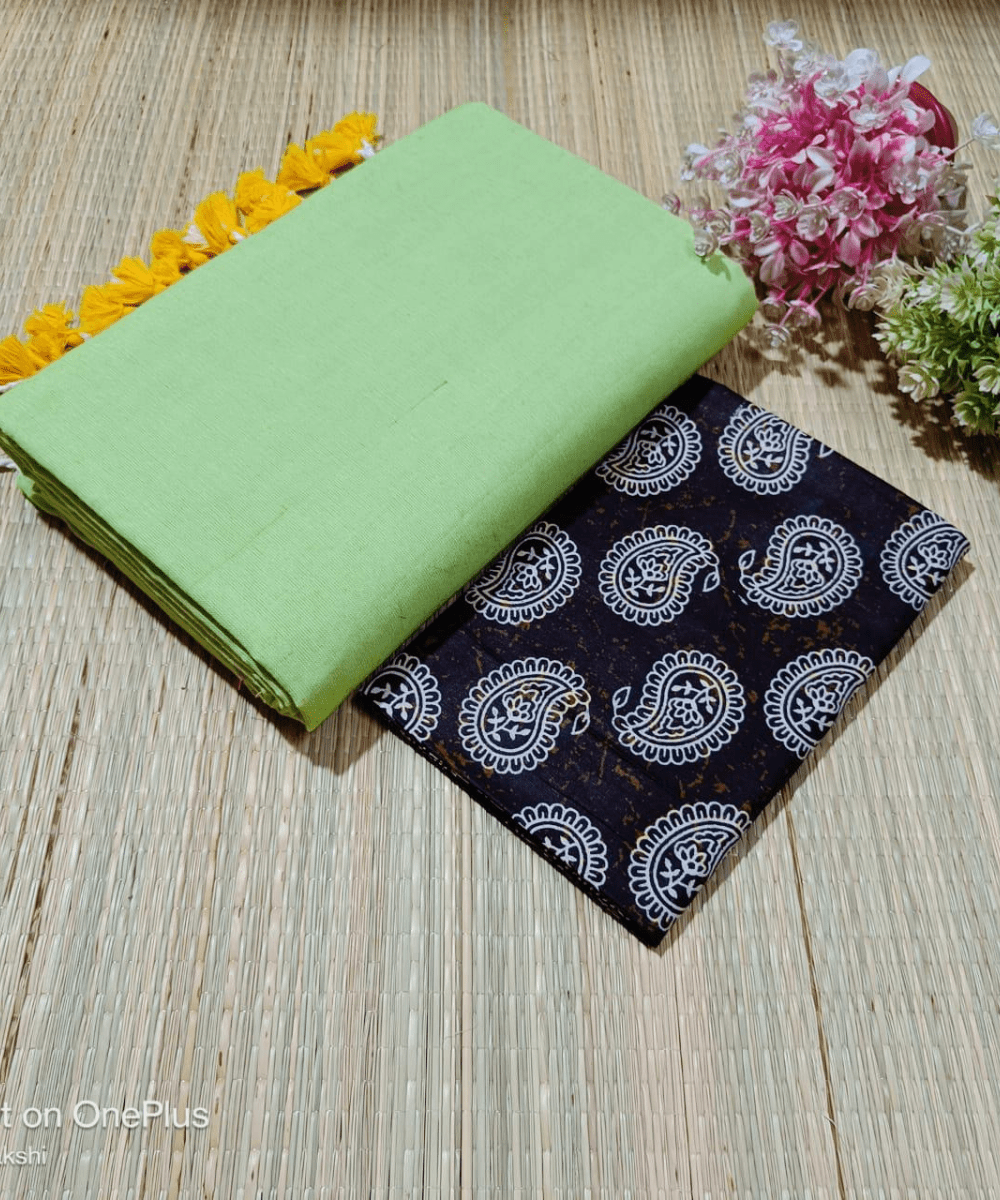 Stay vibrant and fresh with our Fresh Green Plain Khadi Cotton Saree. Made from soft and breathable cotton-by-cotton khadi fabric, this 5.5-meter saree is complemented with a matching running blouse piece and an extra Kalamkari printed blouse piece—perfect for an effortlessly stylish look.