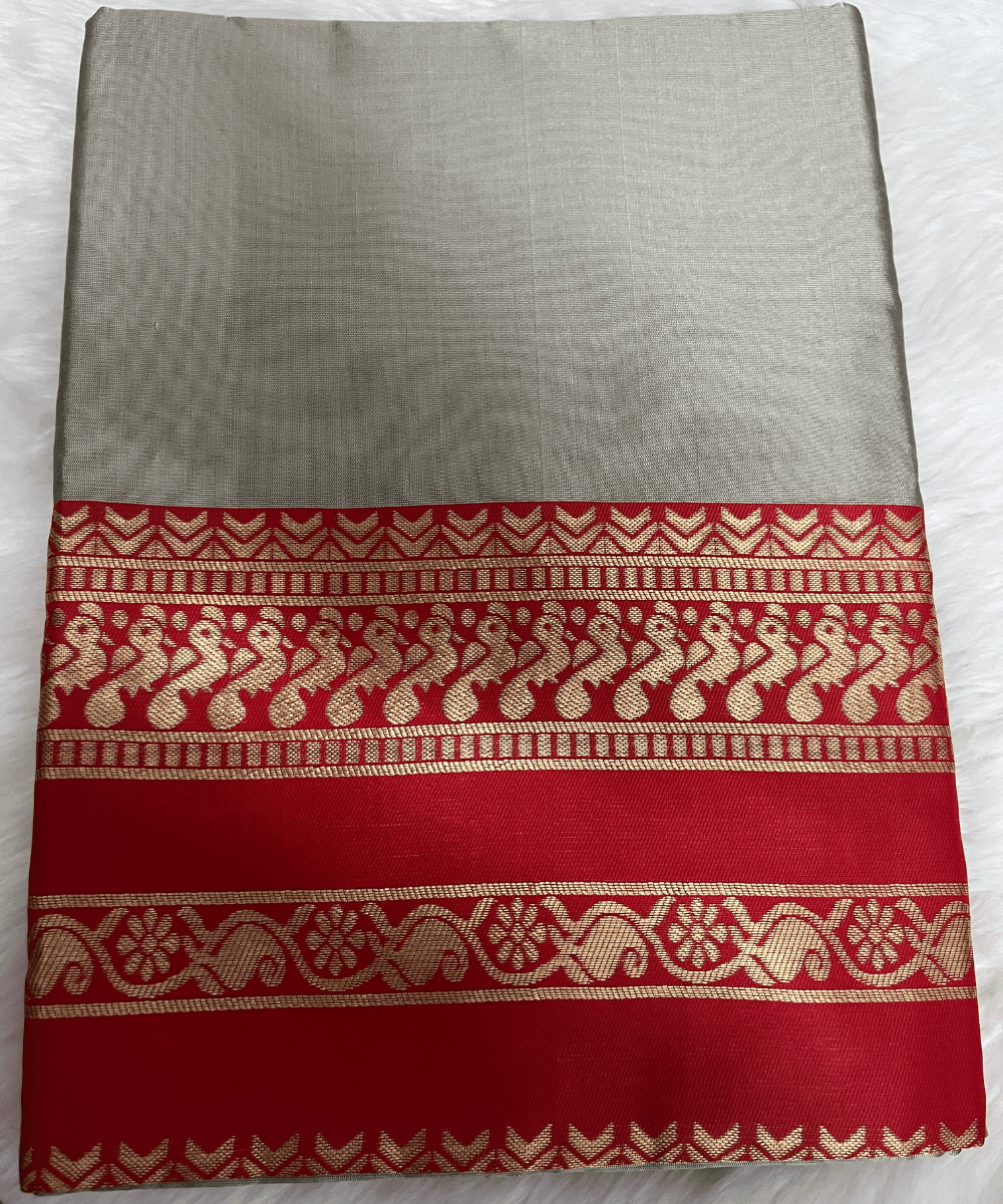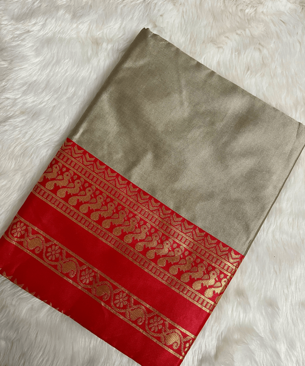Embrace the subtle elegance of our Grey Silk Saree adorned with a rich red contrast zari border — a timeless weave that blends grace with strength. The soft silk fabric drapes effortlessly, offering a luxurious feel while staying lightweight for long-hour wear.