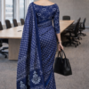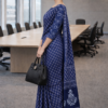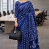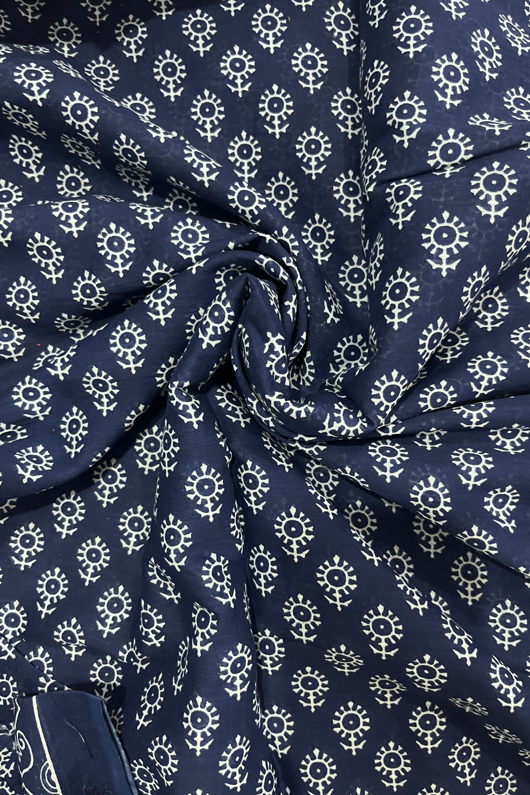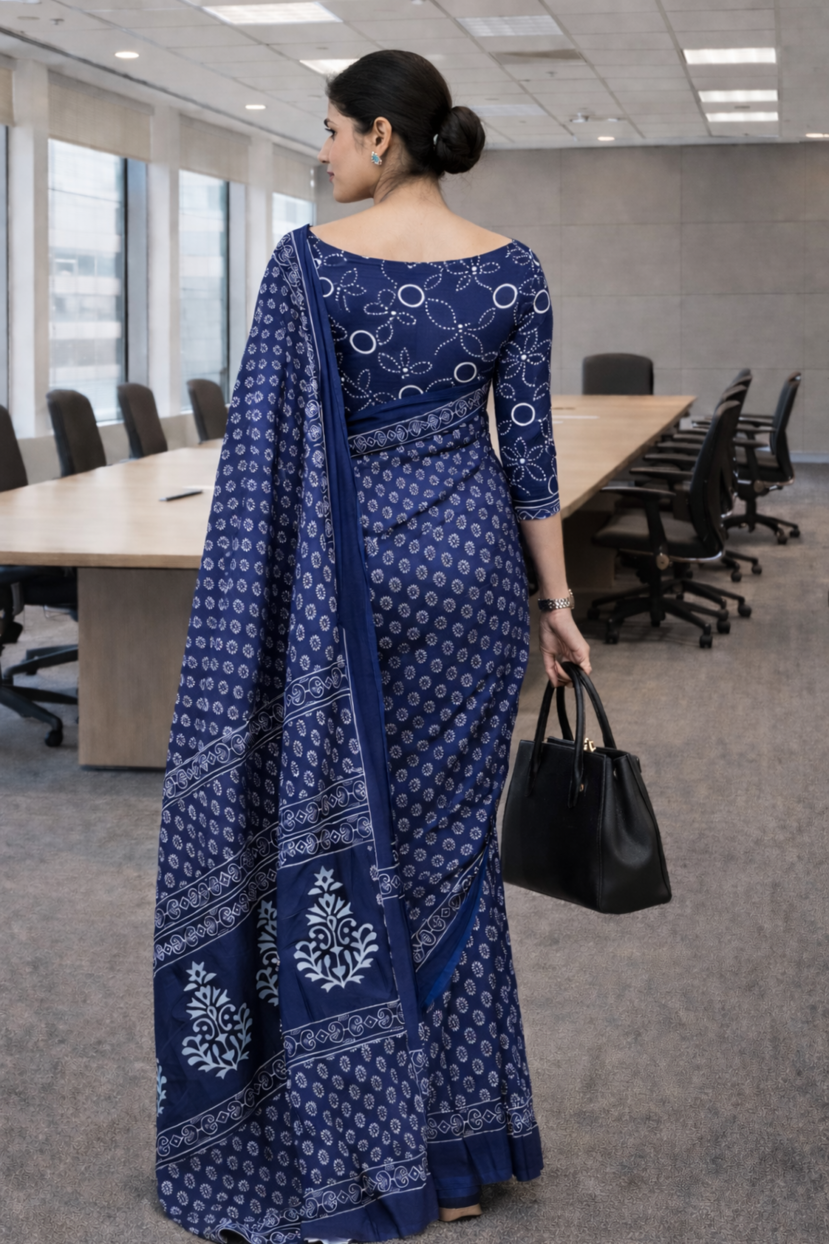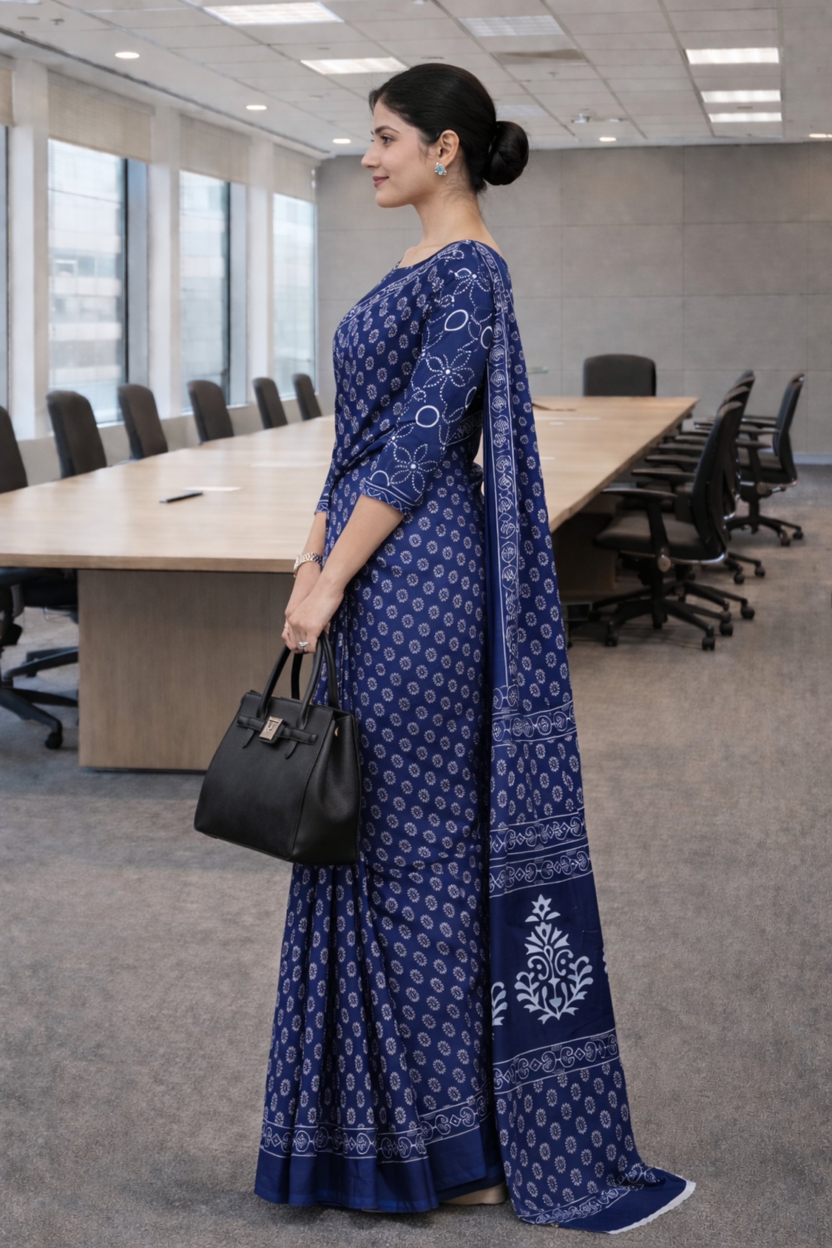 Elevate your everyday workwear with this graceful indigo blue cotton saree, designed for comfort and understated sophistication. Adorned with intricate handblock-inspired motifs, the saree brings a subtle charm while maintaining a professional look. The finely detailed border enhances its overall appeal, making it ideal for office meetings, daily wear, and minimal styling days.
