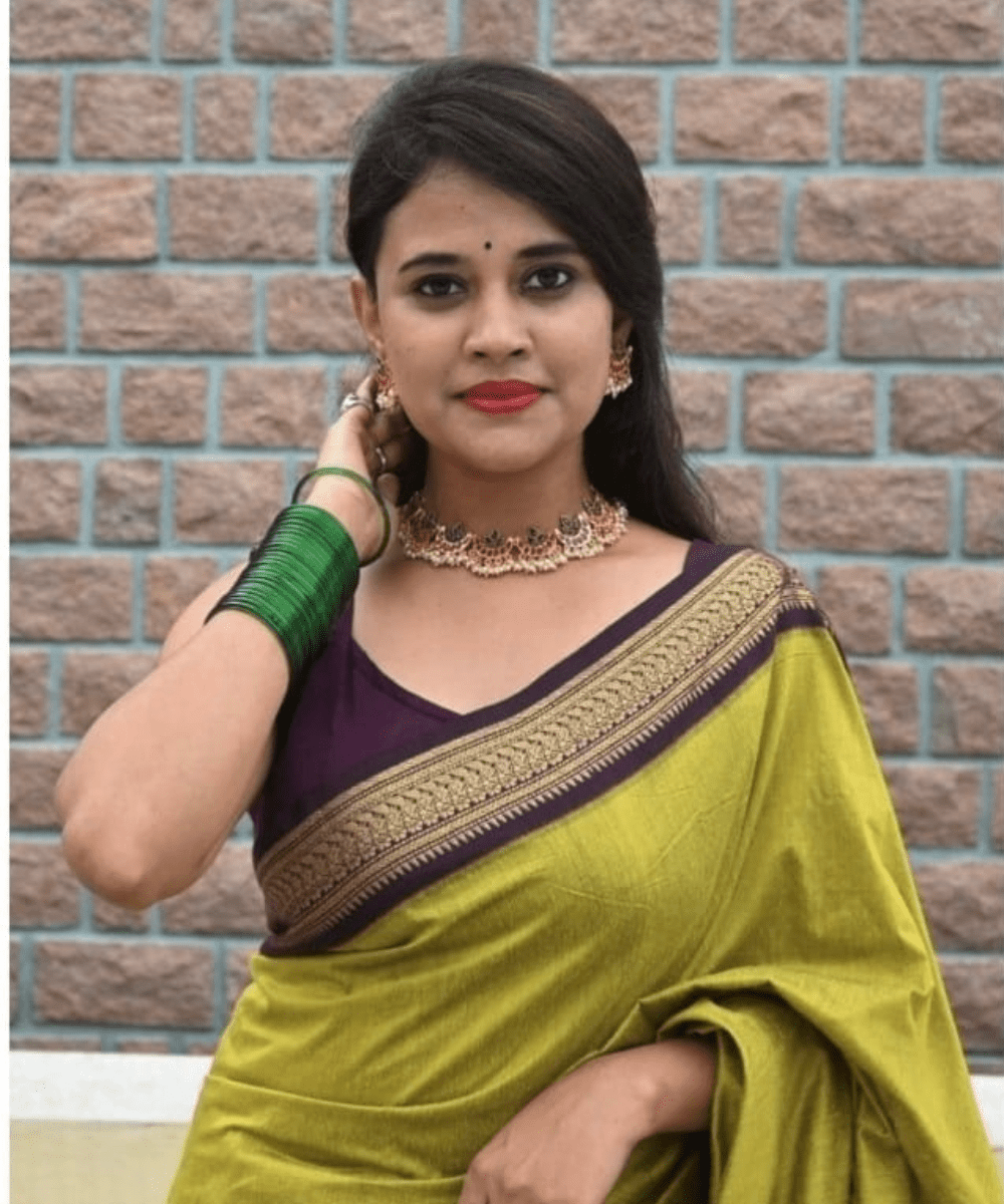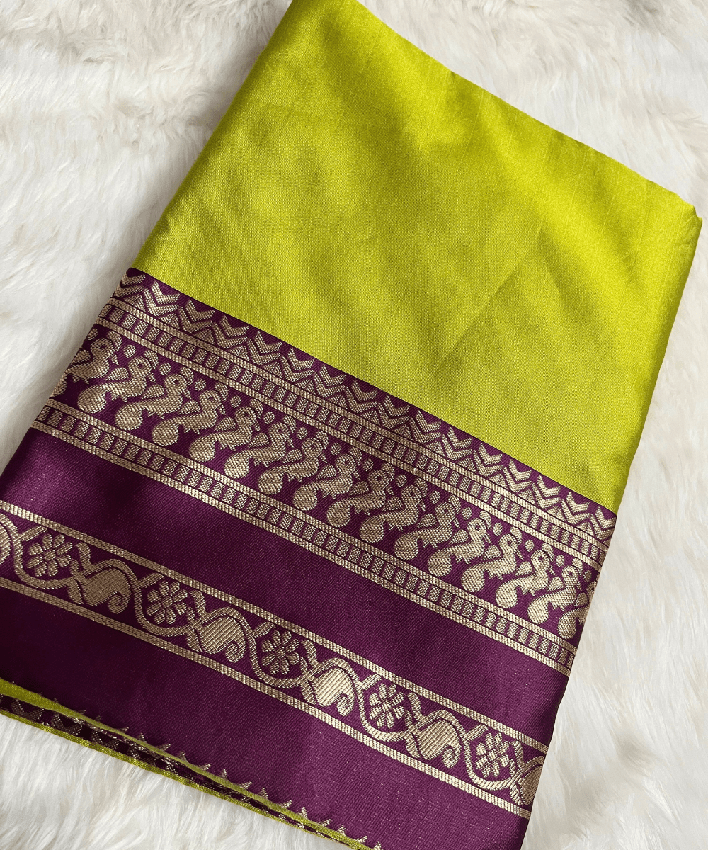 Vibrant yet classy, our Green Silk Saree with a contrasting purple zari border is made for festive moments and joyful memories. The soft silk glows with a subtle sheen, while the rich border adds a pop of bold elegance.