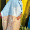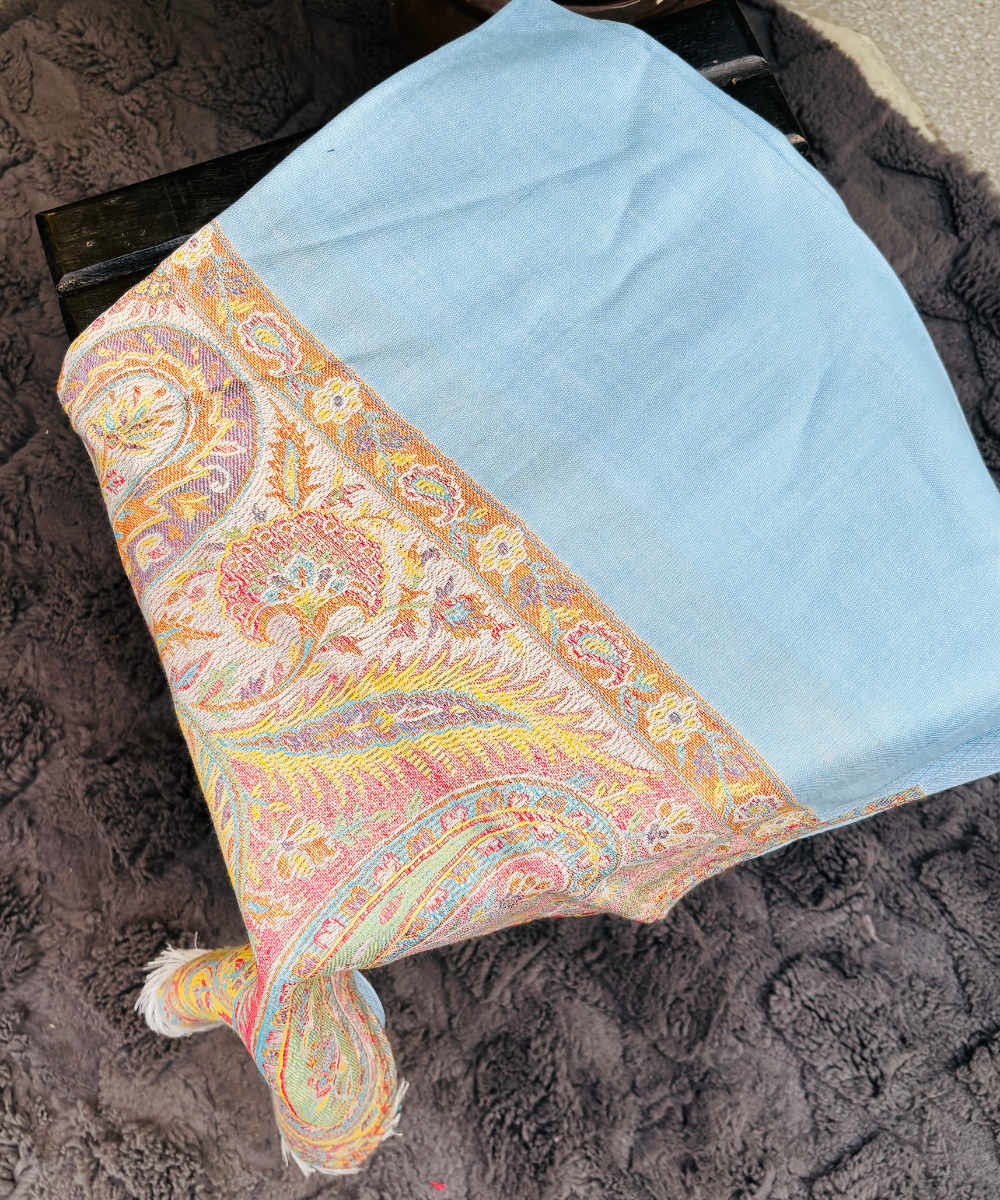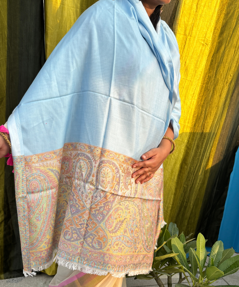 powder blue shawl India, semi pashmina shawl women, pastel border shawl, winter shawl online, soft blue shawl, paisley border shawl