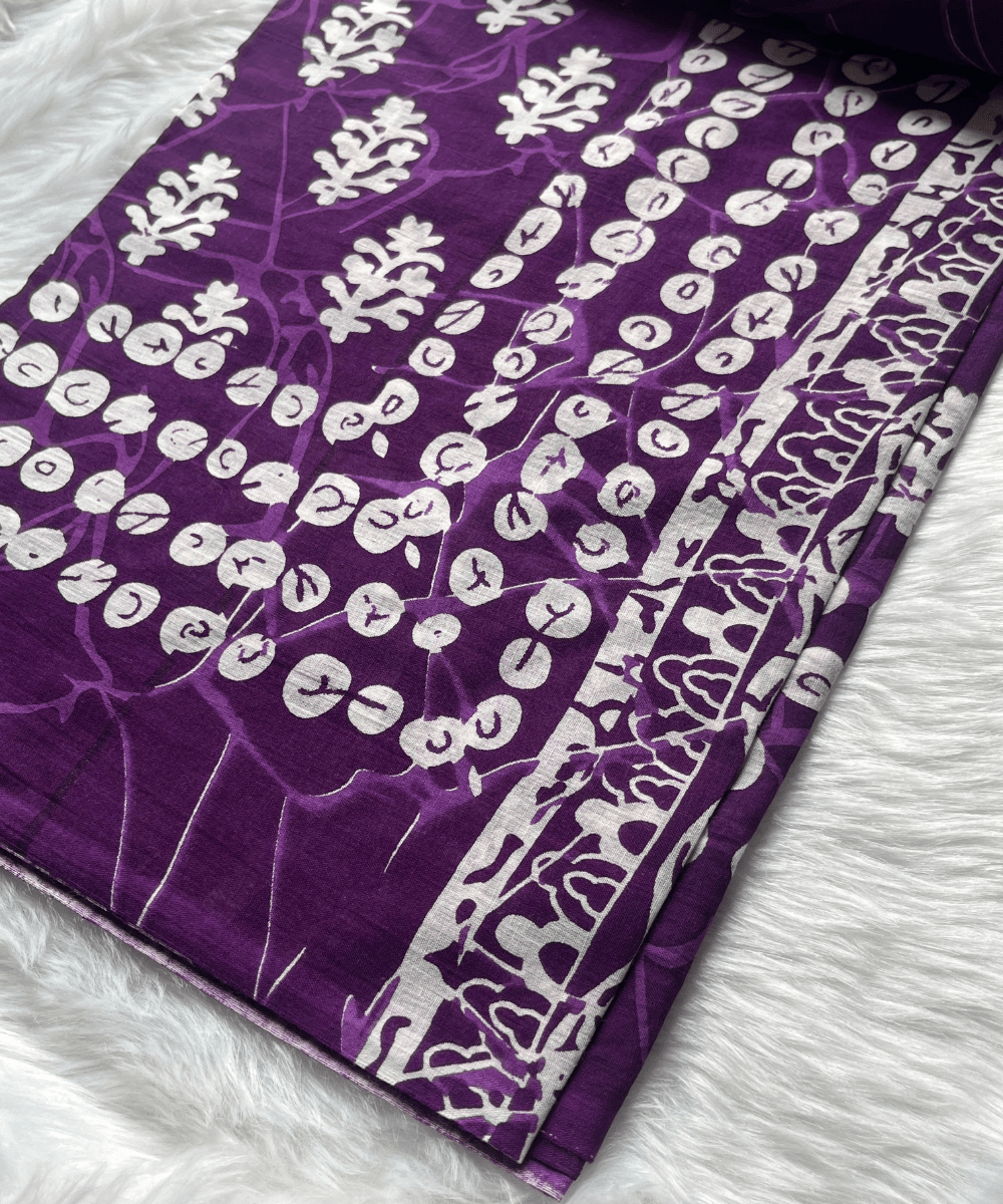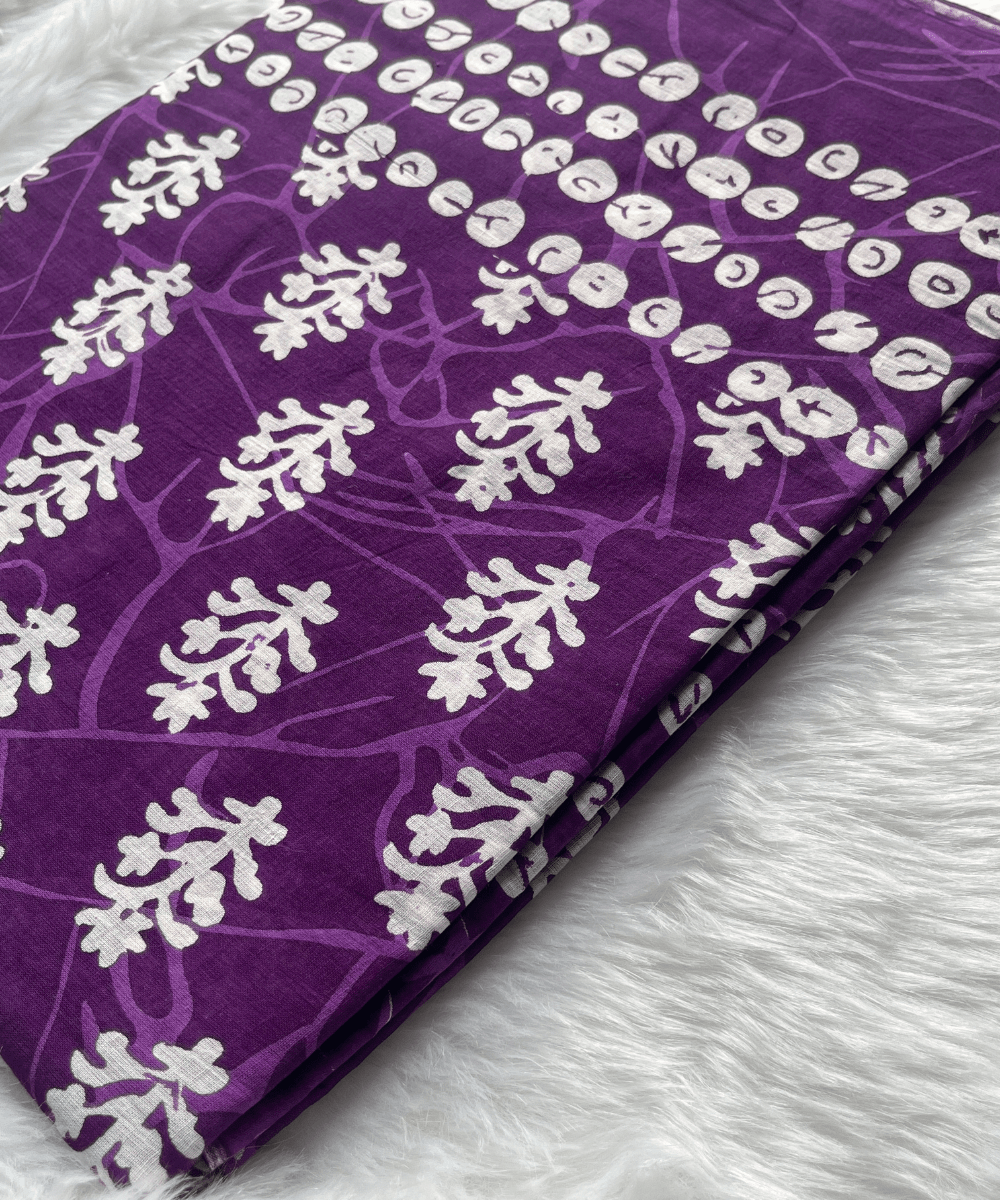 Description: This rich purple saree showcases the timeless beauty of Bandhani tie-dye work in soft cotton fabric. Accented with traditional white motifs and patterns all over, it offers a regal yet grounded aesthetic. Measuring 5.5 meters, the saree provides a flattering drape suitable for festive occasions, family gatherings, or even casual elegance. The included 80 cm running blouse piece makes it easier to complete your outfit with a matching or contrast blouse design.