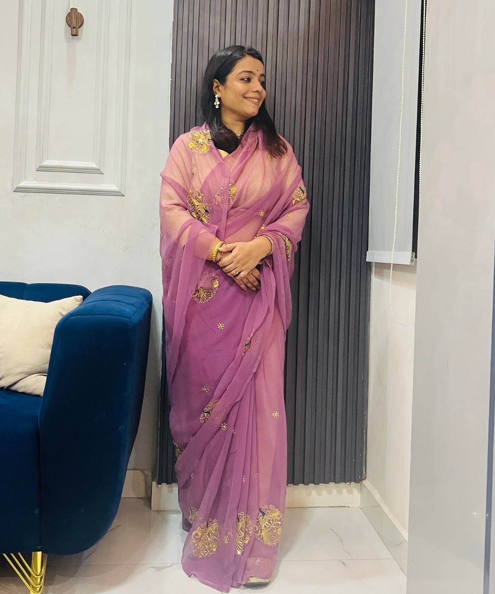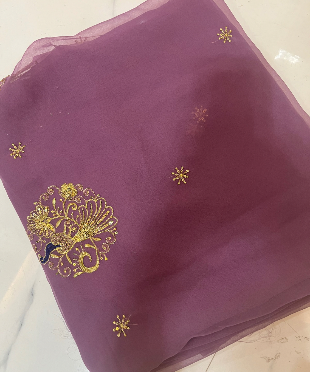 Discover the charm of regality with our Purple Mehfil-E-Husn Rajputana Saree, a creation that resonates with festive glamour. Made from soft georgette, the saree offers a flowing drape adorned with hand-embroidered golden peacock motifs, sequins, and goose thread detailing. With a height of 43 inches and a length of 5.3 meters, it comes with an 80 cm running blouse piece for styling ease. Designed to be both graceful and celebratory, this saree is a timeless addition to your festive wardrobe.