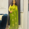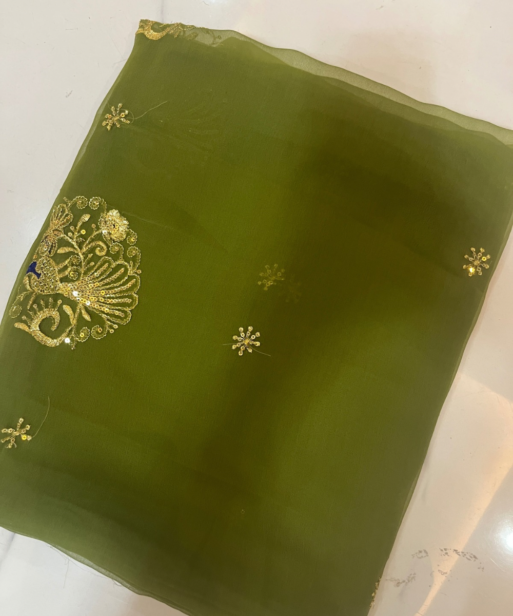 Elevate your festive style with the Mehendi Green Noor-E-Mehfil Rajputana Saree, a masterpiece of handcrafted elegance. Woven in soft georgette, this saree is adorned with golden peacock motifs, sequins, and goose thread embroidery, reflecting the grandeur of Rajputana artistry. Measuring 43 inches in height and 5.3 meters in length, it comes paired with an 80 cm running blouse piece for versatile styling. Its lightweight texture makes it a comfortable yet majestic choice for festive occasions.