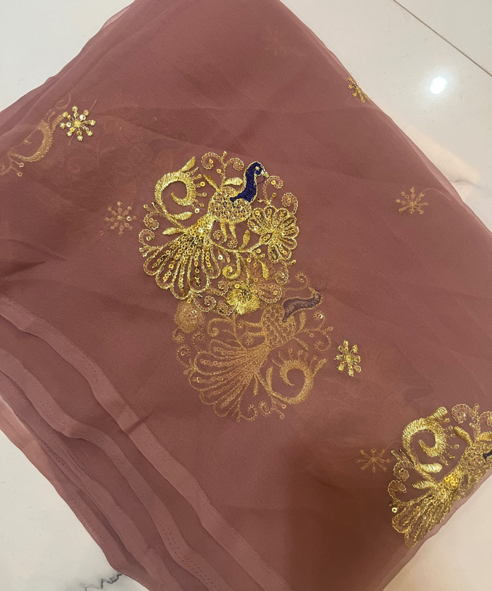 Radiate understated royalty in this Skin Brown Rajputana Saree in soft georgette. Accented with golden peacock motifs, sequins, and fine thread handwork, it includes a running blouse piece. Perfect for festive draping.