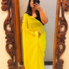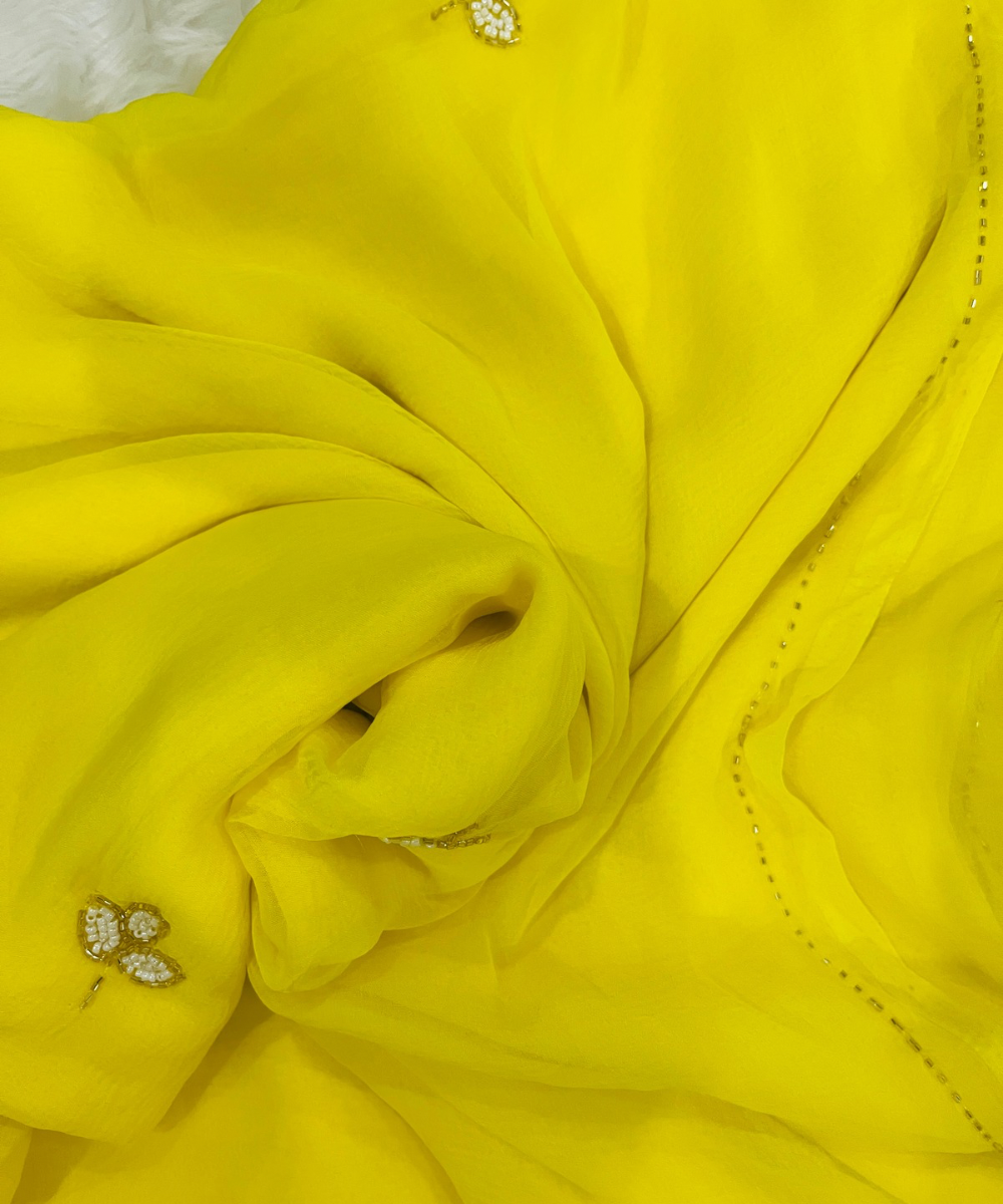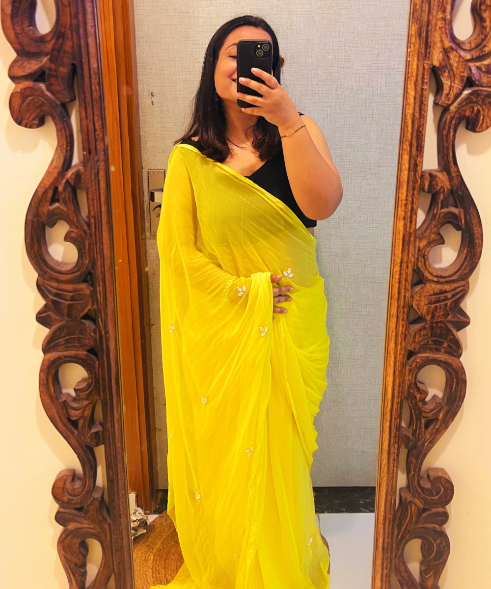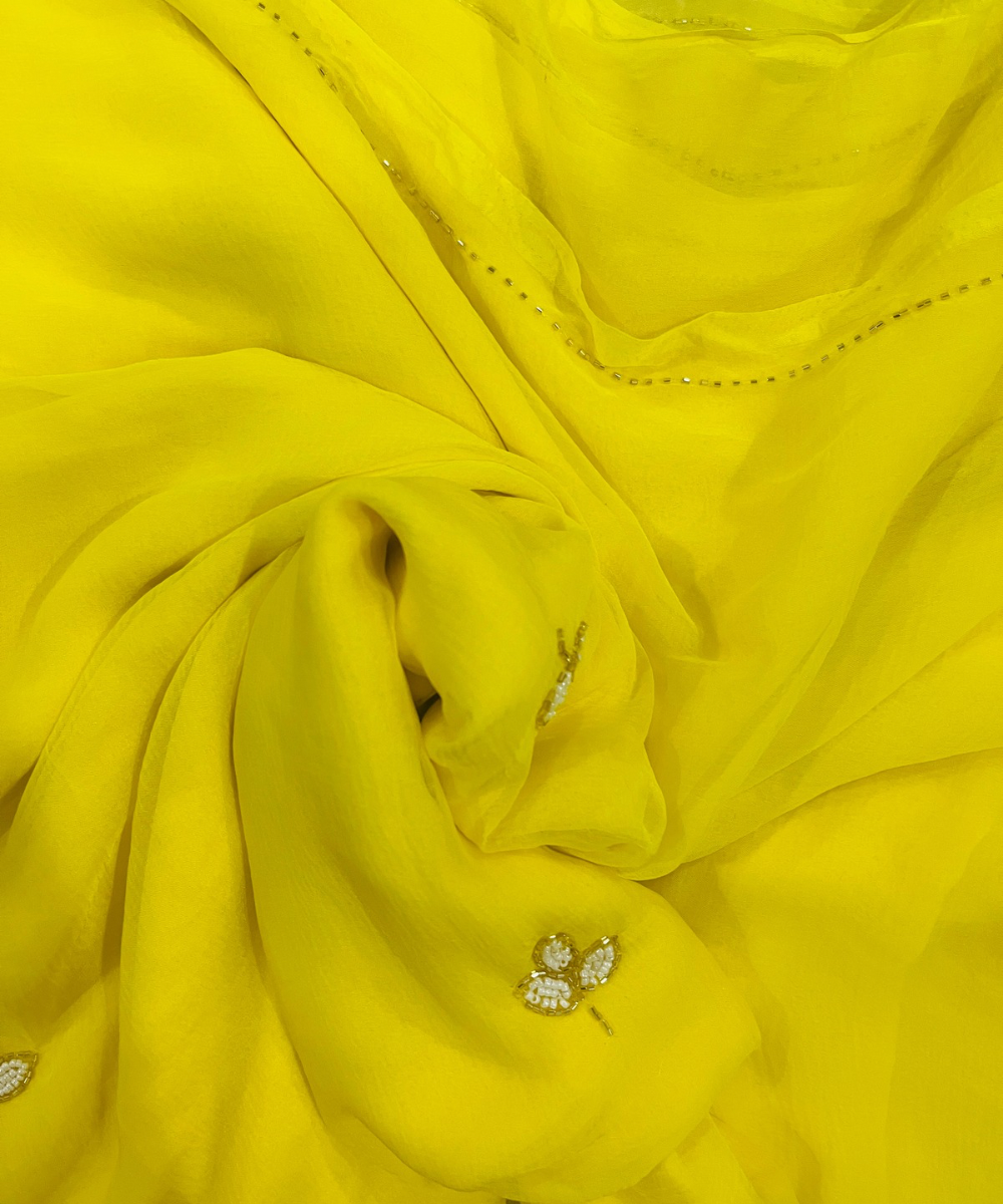 Infuse your celebrations with warmth and positivity in our Yellow Chiffon Saree. Crafted from soft chiffon fabric, it promises a breezy and comfortable drape, adorned with handwork butti that adds a subtle festive sparkle. The cheerful yellow hue makes it an ideal choice for pujas, festive lunches, or daytime events where elegance meets vibrancy. With 5.5 meters of flowing fabric and a 1-meter plain running blouse piece, this saree is versatile, lightweight, and timeless – a perfect addition to your festive wardrobe.